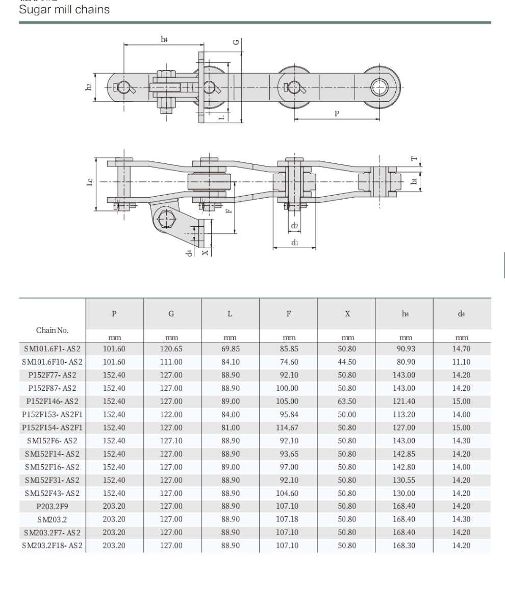 Wir sind ein Hersteller von Zuckermühlenketten in China. Basierend auf unserem Verständnis von Zuckerraffinationsprozessen und -ausrüstung wissen wir, wie man eine Patenkette mit gebogenen Seiten und Anbauteile sowie eine Zuckermühlenkette herstellt, die für langfristige Übertragungs- und Hebeanwendungen in der Zuckerraffinationsindustrie geeignet sind.