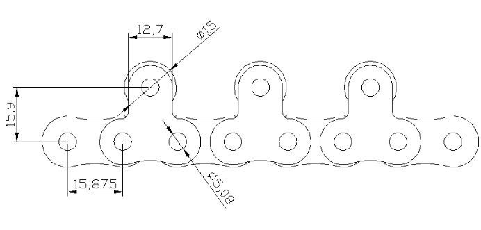 Obere Rollenbahnkette is basierend auf ANSI-Rollenkette und Double-Pitch-Rollenkette. Eine zusätzliche Rolle ist oben auf der Kettenabstandslinie montiert, um Materialien direkt darauf zu befördern. Materialien können geladen, abgenommen oder vorübergehend angehalten werden, während die Kette ist im Dauerbetrieb. Kunden können den Abstand der oberen Walze festlegen.